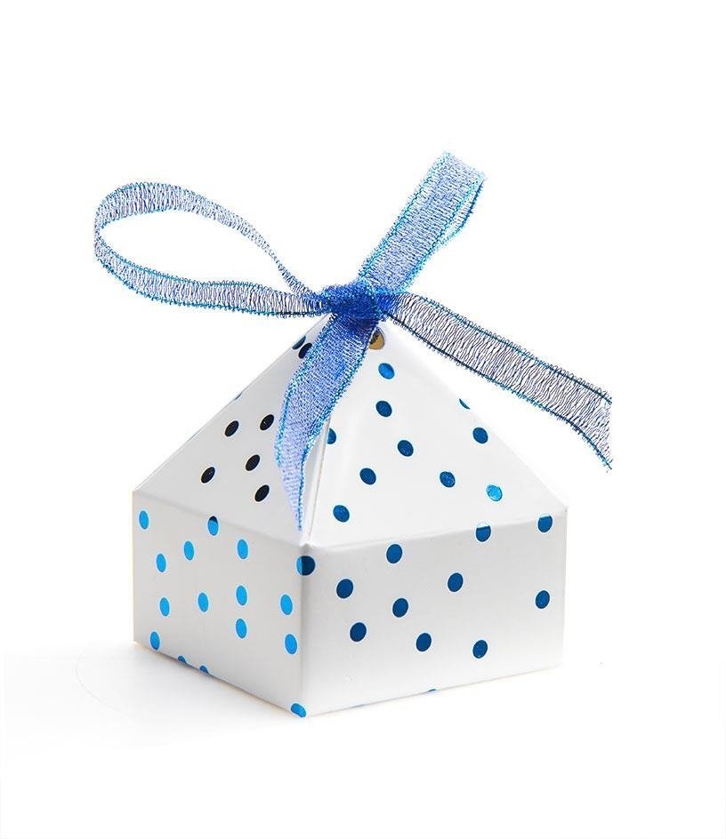 Pudełeczko w białym kolorze z niebieskimi kropeczkami (jak na zdjęciu).