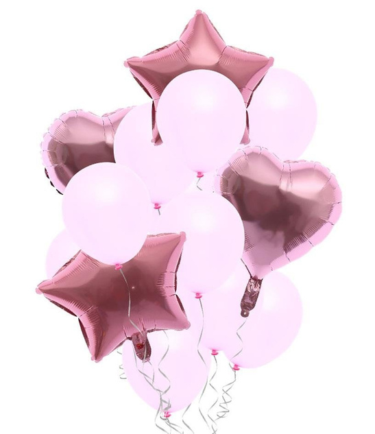 Zestaw kilku balonów w kształcie tradycyjnym, w kształcie gwiazdki i serca. Balony posiadają ten sam rozmiar, ale można je znaleźć w różnych zestawieniach kolorystycznych. Cechuje je trwałość materiału i przepiękna, metaliczna barwa. Modne odcienie złota tradycyjnego i różowego w połączeniu z czernią, czerwienią czy kolorem niebieskim z pewnością wpiszą się w każdą modną imprezową aranżację. Balony przeznaczone są do napełniania helem lub powietrzem.