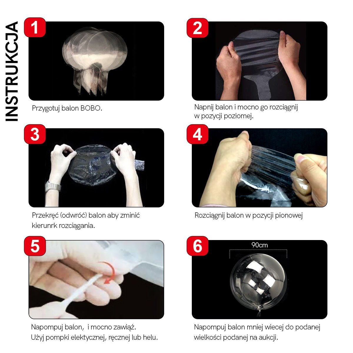 - Łatwość w użyciu: Przed użyciem balony są już rozciągnięte, co ułatwia ich napełnienie. Zalecamy użycie pompki elektrycznej lub ręcznej dla szybkiego i łatwego napełnienia.