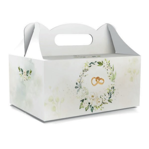 Bardzo eleganckie i oryginalne pudełka na ciasto z kwiatowym motywem i obrączkami.