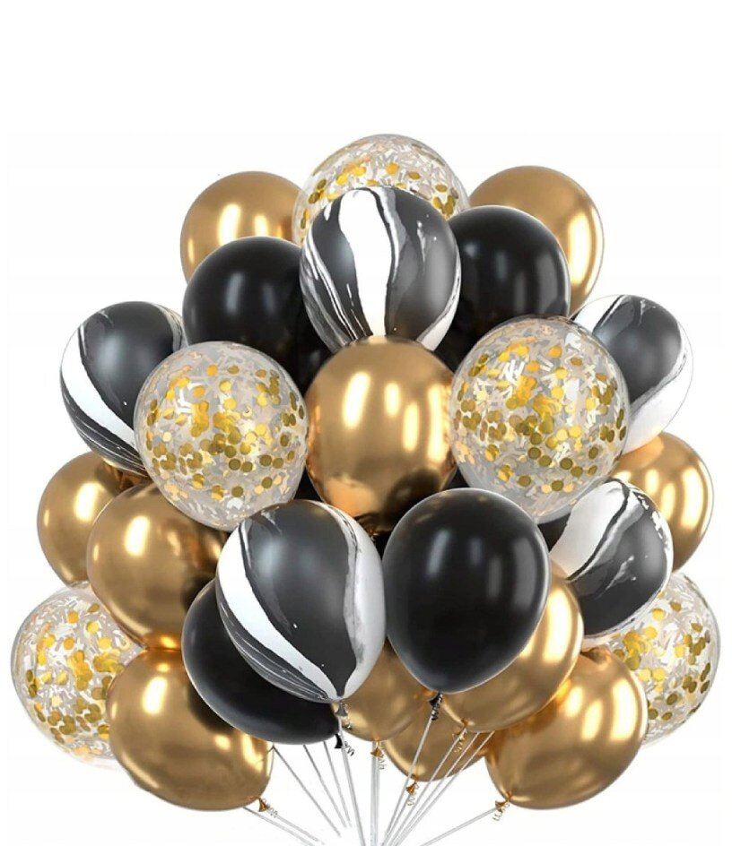 - Rodzaje balonów: Czarne, złote, marmurkowe oraz przezroczyste balony ze złotym konfetti.