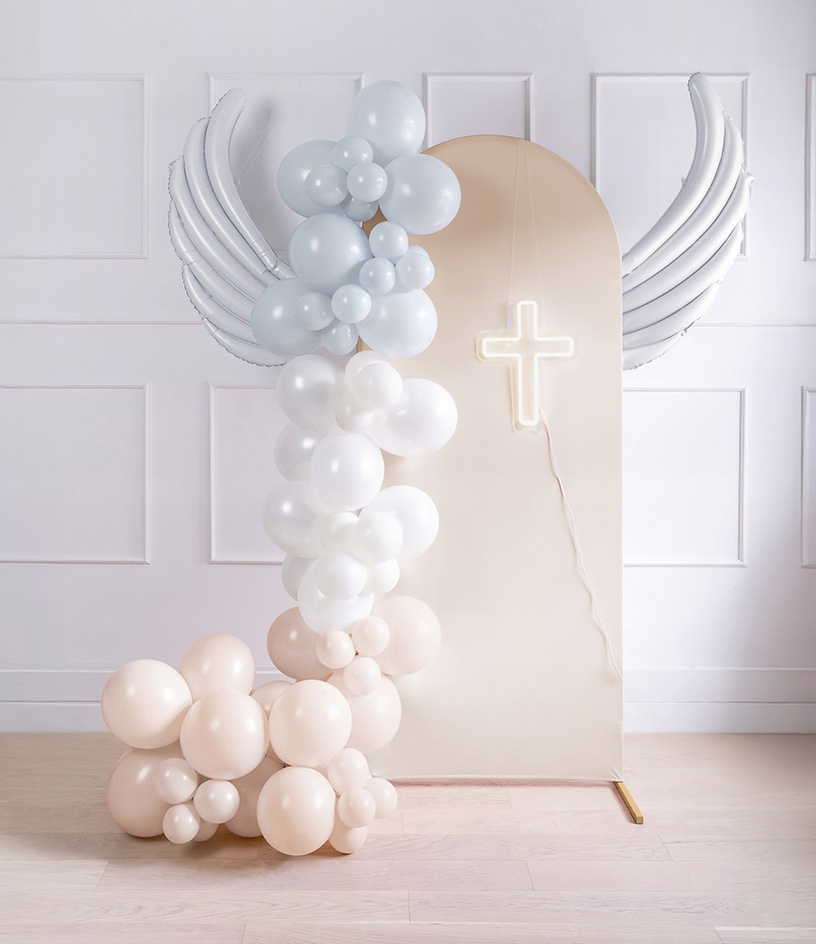 Balony doskonale sprawdzą się jako element girlandy balonowej, samodzielna dekoracja ścienna lub tło do fotografii – np. do stworzenia „anielskich skrzydeł” za plecami dziecka.