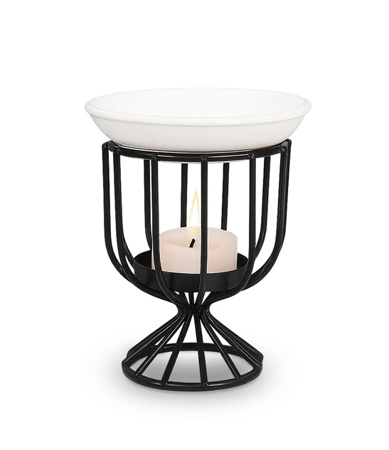 Ten elegancki świecznik z funkcją kominka zapachowego to idealne połączenie dekoracji i praktycznego zastosowania. Wykonany z lakierowanego metalu w czarnym kolorze, wyposażony w ceramiczny talerzyk do podgrzewania wosków lub olejków eterycznych. Po jego zdjęciu pełni funkcję świecznika – pasuje do świeczek o średnicy do 5 cm.