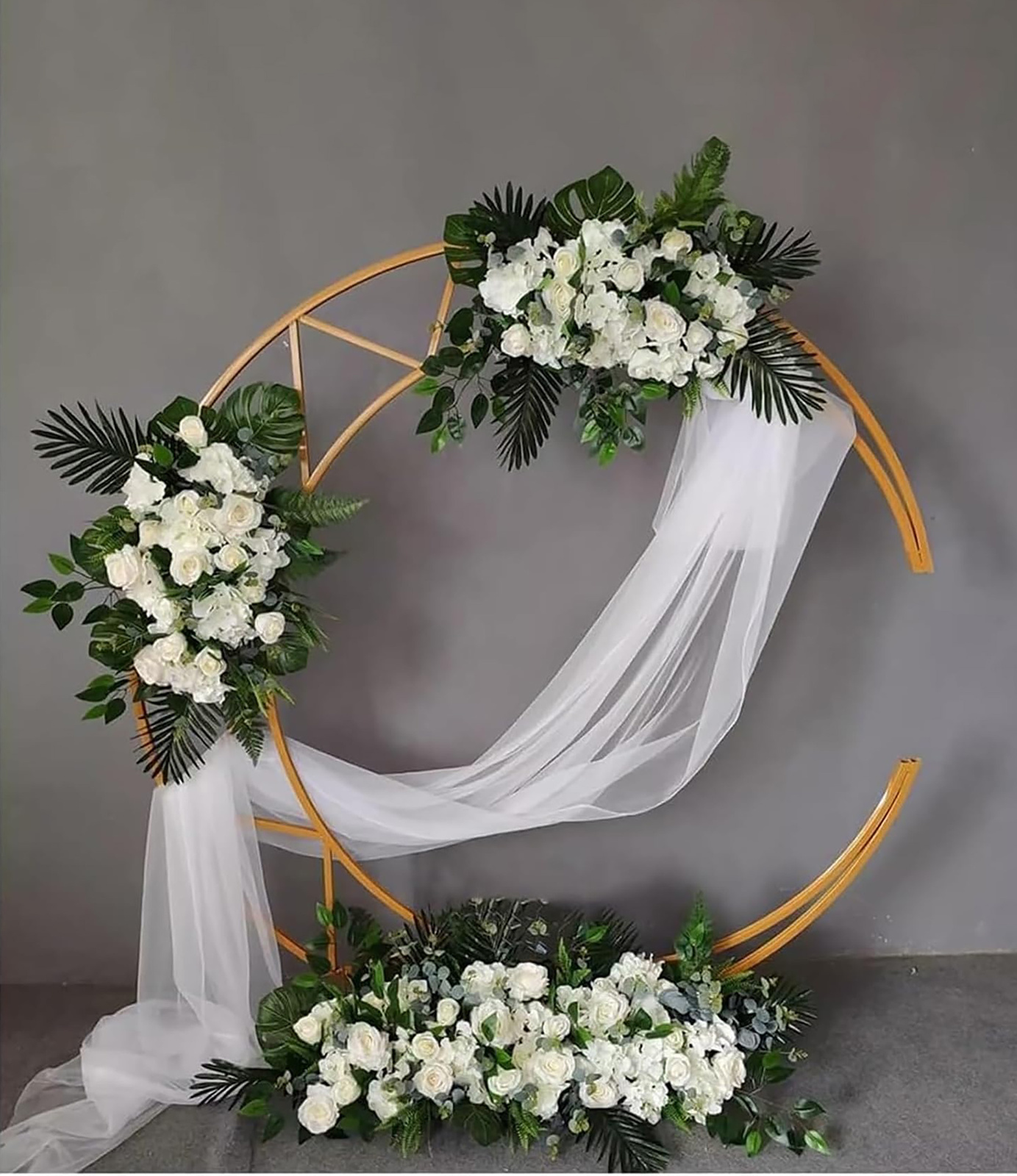 Ten złoty stojak w kształcie półksiężyca to idealne tło do romantycznych sesji zdjęciowych, ceremonii ślubnych i dekoracji eventowych. Jego geometryczna konstrukcja pozwala na kreatywne ozdobienie kwiatami, balonami czy tkaninami. Dzięki solidnej podstawie i lekkiej konstrukcji jest łatwy w transporcie i montażu.