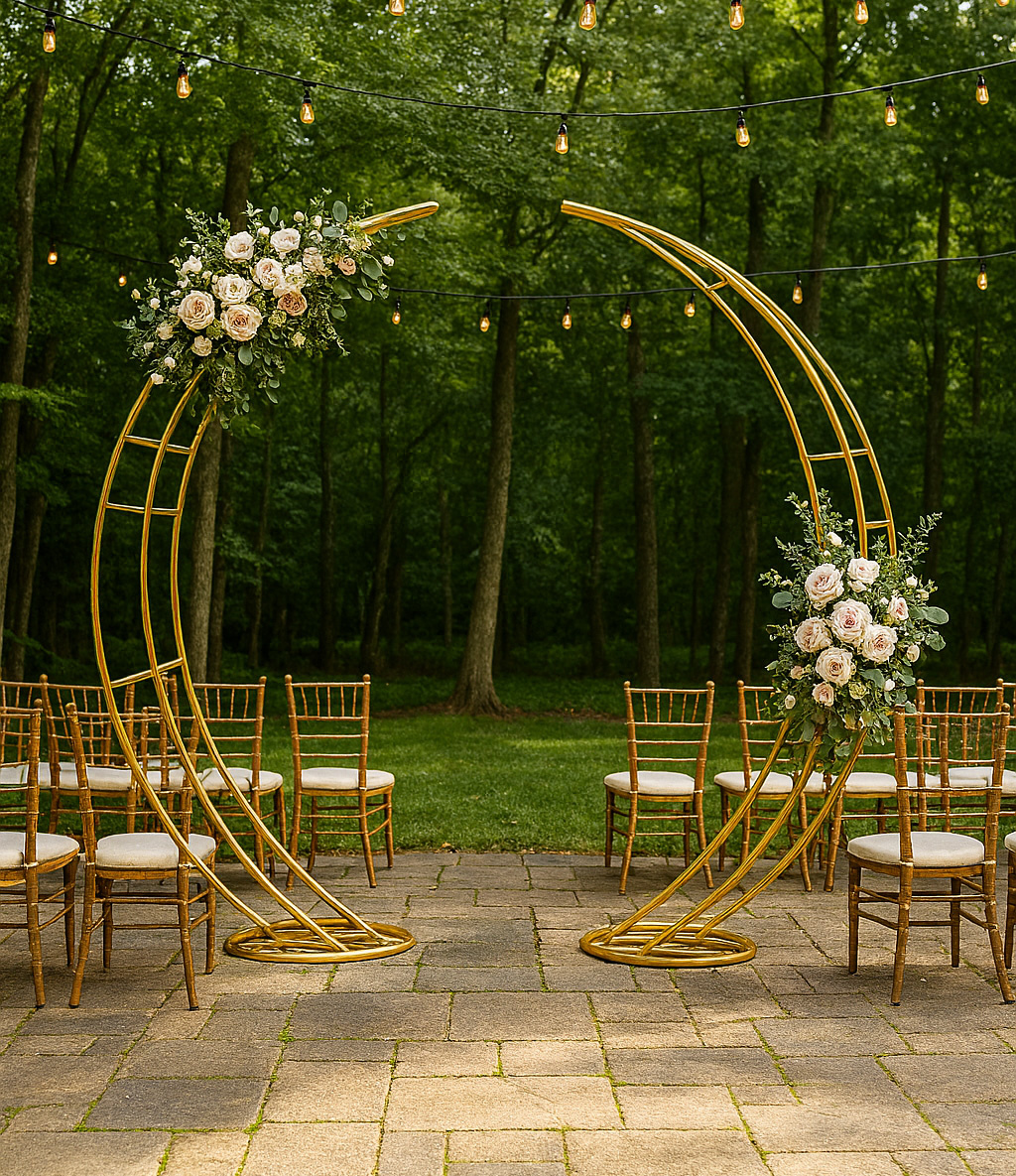 Podczas plenerowego ślubu dwa złote łuki tworzą romantyczne przejście do strefy ceremonii. Otoczone kwiatami i światłem, stają się centralnym punktem dekoracji, który zachwyca gości i wygląda doskonale na zdjęciach.