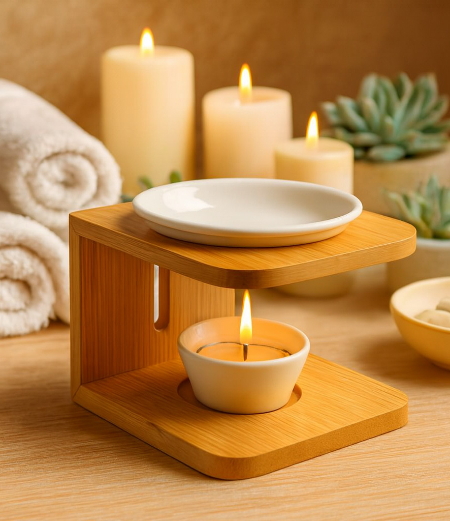 • Kominek bambusowy z ceramiką na olejki i woski zapachowe. Elegancki design, relaks i aromaterapia.